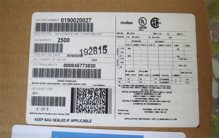 0190020027 American Molex male and female plug terminal 6.3mm spring terminal block with sleeve 14-16