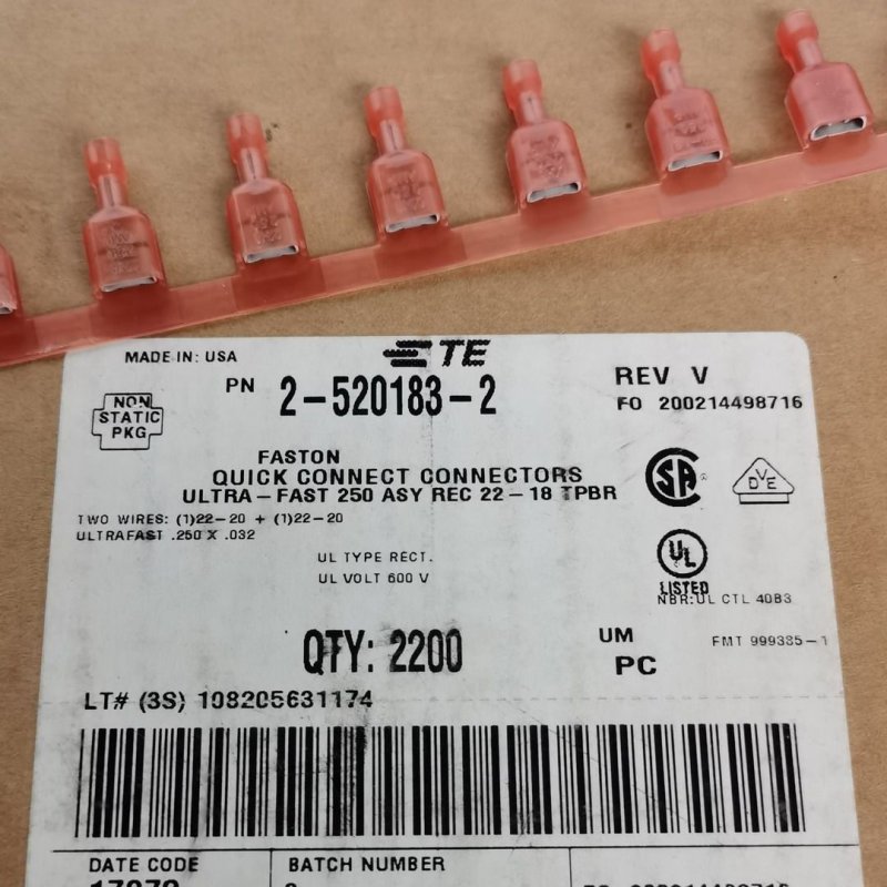 TE AMP 2-520183-2 Quick Disconnect Receptacle, Fully Insulated, 22 – 18 AWG, .32 – .82 mm² Wire, 6.35 mm [.25 in] Tab Width, F-Crimp, Straight, Brass, Ultra-Fast 250